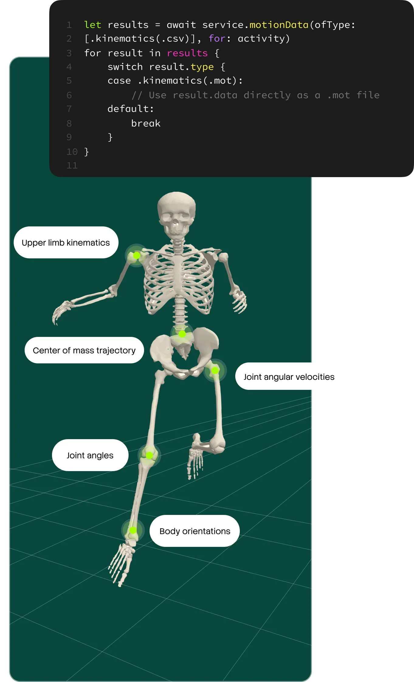 Export 3D kinematics, marker trajectories, and computed metrics in standard formats. Feed directly into NumPy, pandas, OpenSim, or your own analysis pipelines without format conversion overhead.