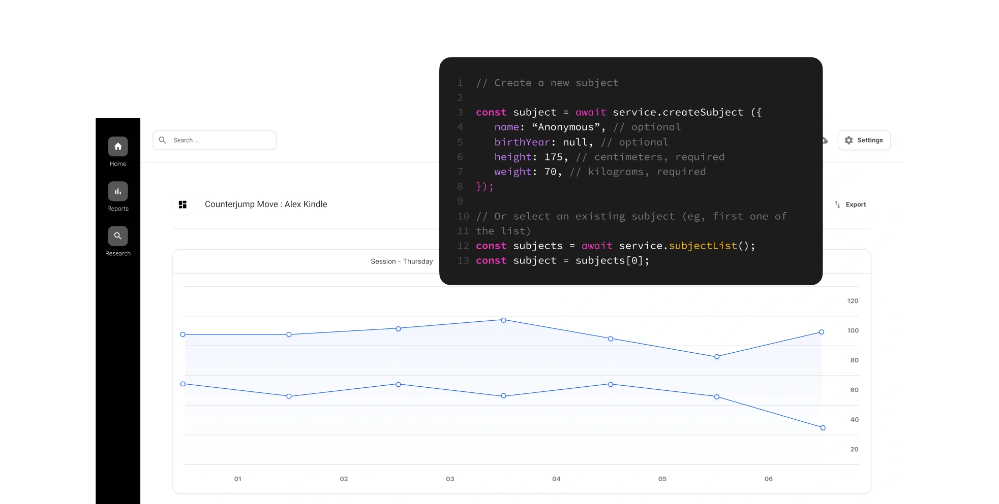 For clinics, athletic programs, and research teams. Route results directly into your EMR, AMS, or internal database without disrupting staff workflows, or access kinematics and metrics programmatically for pipelines built around NumPy, pandas, or OpenSim.