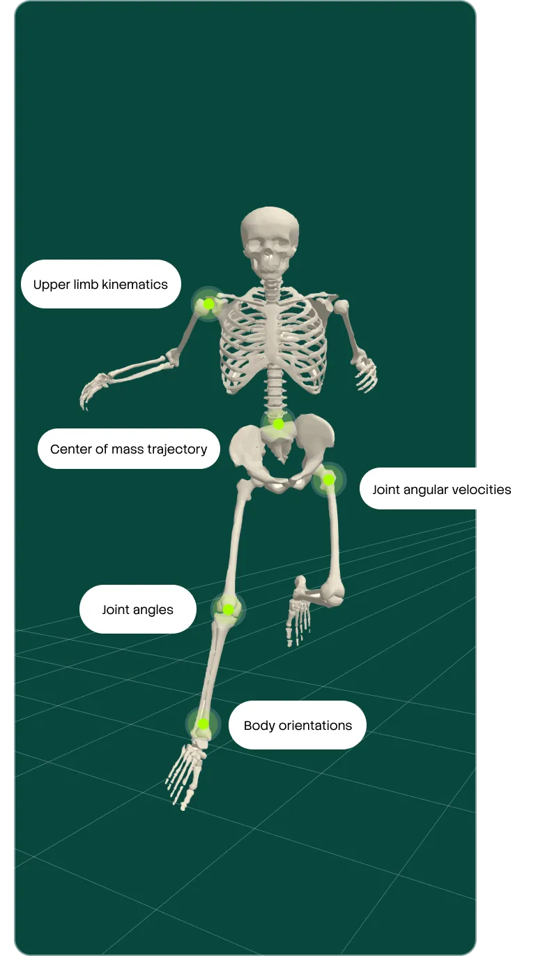 Videos are automatically converted into an accurate 3D biomechanical model, delivering detailed time-series data on joint and body kinematics.